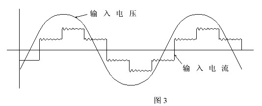 由于晶閘管是一個非線性的電氣元器件,所以由晶閘管組成的中頻感應電源對于外部輸入電源是一個非線性的負載。也就是在一個周期性的正弦電壓輸入時,它的阻抗是變化的,電流不是正弦波形,見圖3。在電流突變時在正弦電壓波形上有短時尖峰。